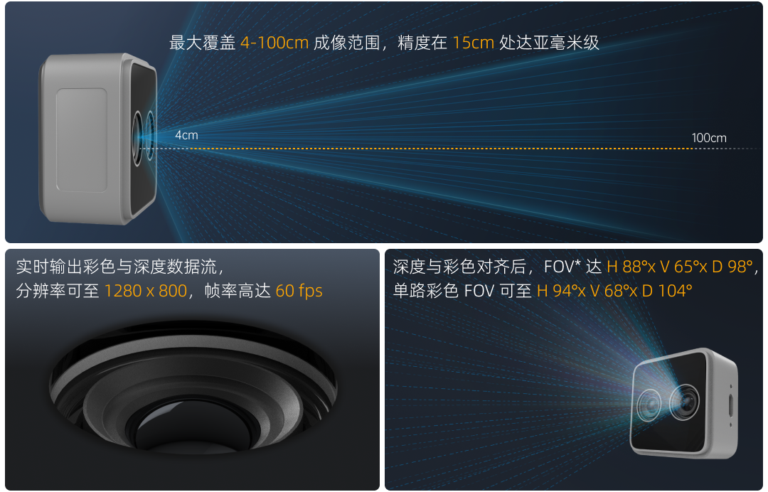 目前主流腕部3D相机普遍存在近距性能弱、视场角小、模式单一等问题。以某主流产品为例,其最近工作距离为7厘米,视场角仅87°×58°,且无法切换成像模式。