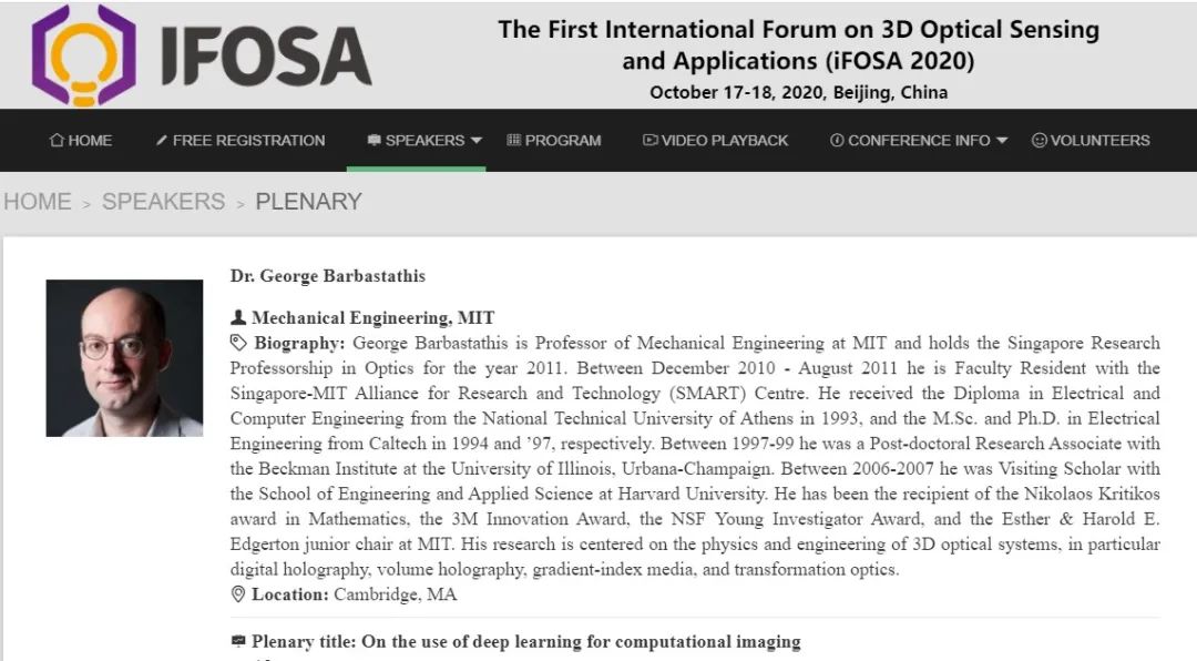 △ 美国麻省理工学院机械工程系终身教授、美国光学学会会士Dr. George Barbastathis教授将作大会报告Onthe Use of Deep Learning for Computational Imaging。Dr. George Barbastathis教授是世界级3D光学成像系统专家,曾常年担任Digital holography,Focus onMicroscopy等国际重要光学领域大会组委会执委。