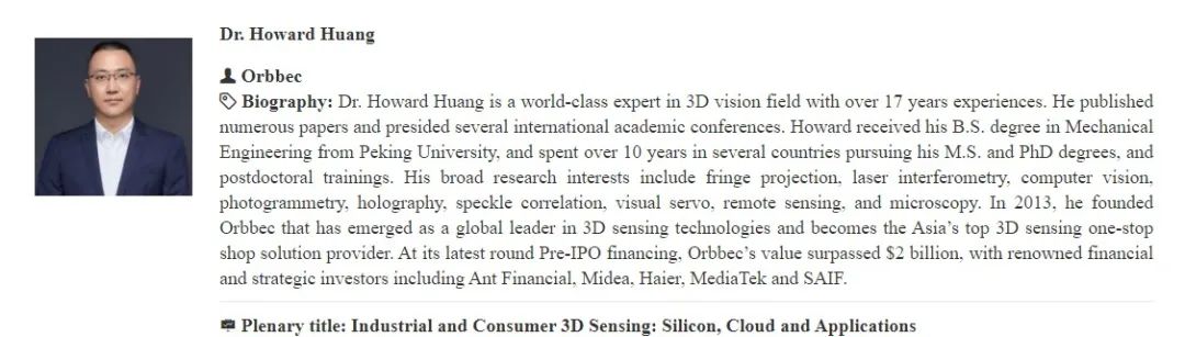 黄源浩(Dr. Howard Huang)的大会报告题目为Industrial and Consumer 3D Sensing: Silicon, Cloud and Applications,报告时间为北京时间10月18日上午9:00-10:00。黄源浩将从个人的求学、科研及创业经历出发,分享他对3D感知底层技术研发与行业未来发展趋势的看法,启迪年轻一代学子钻研学术、投身产业、拥抱创新。